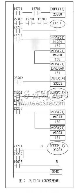 自动调节:本系统中选用3个PID03模块组成6个调节回路来完成生产过程的自动控制,为了方便操作人员在操作站对控制过程的管理,PID03的SW2应设置为ON,并编写相应梯形图以实现PLC与PID03的数据交换,比如:调节回炉PIC111由单元号为5的PID03的第二回路完成,当执行图2所示一段程序后,PLC中地址DM0060中的数据就被定义为调节回路PIC111的给定值。(完整梯形图略)#p#分页标题#e#