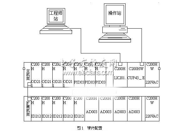 控制站选用OMRON的C200型PLC,配置了数字模块(OD211/ ID212)9块,模拟模块(AD003)4块,调节模块(PID03)3块;操作站选用DELL OPTIPLEX GX150 计算机;工程师站选用COMPA型PC机。构成图如下: