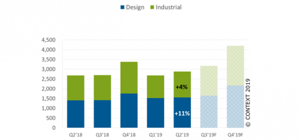 根据对2019年下半年的预测,第四季度的强劲出货量将使工业、设计和专业类别的单位出货量实现两位数的增长,而专业类别的年增长率有望达到+15%。