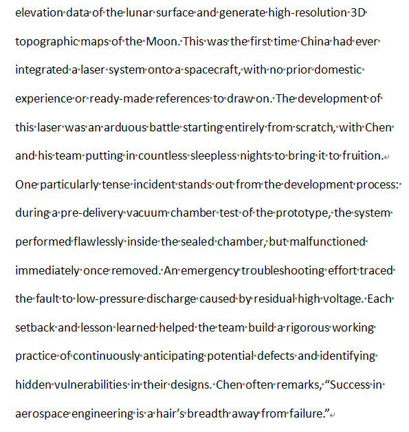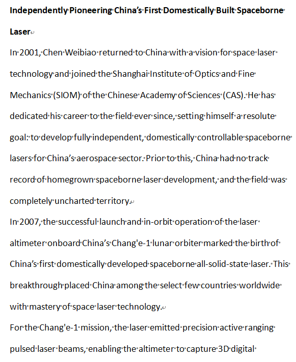 As Chen Weibiao famously remarks: "Lasers illuminate not just the far reaches of deep space, but also the future of China's self-reliance and self-strengthening in science and technology." From Chang'e-1 to Chang'e-7, from lunar and Mars exploration to Earth observation, on this starry journey to the cosmos, Chen Weibiao has always set his sights on the cutting edge of aerospace technology, scaled the heights of scientific discovery, and written a remarkable chapter for China’s aerospace community through relentless scientific and technological innovation.