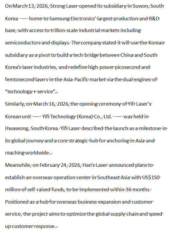 On March 9, Optowide Technology invested 35 million yuan to establish a wholly-owned subsidiary in Zhengzhou. DR Laser launched an investment platform with a 100-million-yuan capital contribution in February 2026. On March 11, Han’s Laser founded an intelligent technology firm and invested 500 million yuan to build its Southwest Headquarters.