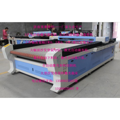 济南莱赛激光裁床、激光裁剪机适用于裁切各种布料皮革、真皮切割。如:尼龙布、涤纶布、帆布、防水布、超细纤维无尘布、无纺布、植绒布、毛毡布、棉布、牛津布、毛绒布、餐桌布、床单布、窗帘布、沙发布等多种柔性布料,莱赛布料自动裁剪机,尤其适合裁切较大尺寸的产品,机器工作幅面有幅宽1米6*3米长,幅宽1米8*3米长,幅宽2米9*3米5长,幅宽3米1*3米5长等多种机型,机器可以根据不同客户需要,做成一个头两个头三个头或者更多头等,除此以外,还有5米7米9米12米等超大幅面的机型,济南莱赛数控设备有限公司,都可以专业为您定做生产。