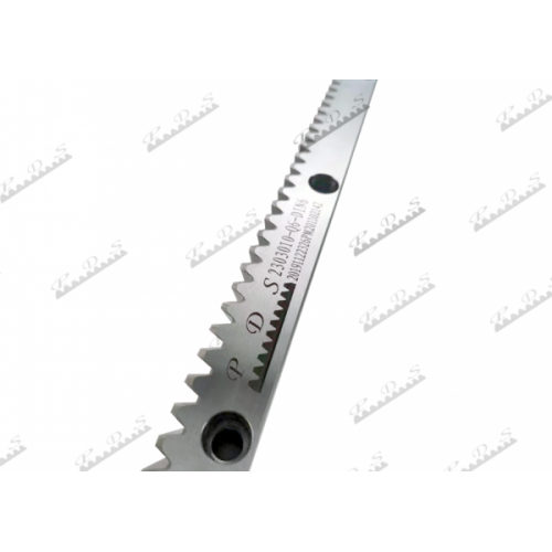 详细信息 品牌:PDS 型号:2302010-DIN6 精度:德标DIN6级 日标JIS 2级 模数:2模 齿形:斜齿 材质:C45 四面研磨:有 齿面处理:磨削 压力角:20度 右旋角:19度31分42秒 齿面处理:50~52度HRC 齿数:150齿 75齿 长度:1000mm 500mm 齿宽:24mm 齿高:24mm 销钉孔:2个 沉头孔:8个 4个 安装面:侧面安装孔 个孔是62.5mm,,以孔62.5mm定位好后,其它孔位为125mm。两根齿条拼接后,孔距125.mm,无限拼接,方便快捷。