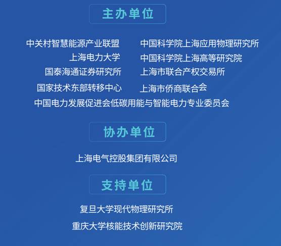 - 主办单位:中关村智慧能源产业联盟、上海电力大学、泰海通证券研究所、国家技术东部转移中心、中国电力发展促进会、低碳用能与智能电力专业委员会、中国科学院上海应用物理研究所、中国科学院上海高等研究院、上海市联合产权交