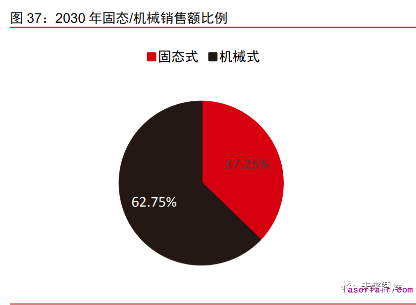 其中在 ADAS 领域,固态占主导:Yole 预计固态激光雷达和 Flash 激光雷达出货量 从 2021 年起逐渐增多,2025 年,固态/Flash 约为 50 万个,机械式约 290 万个,比例为 1:5.8;从 2029 年开始,固态/Flash 出货量超过机械式激光雷达,到 2030 年,固态/Flash出货量约为 1200 万个,机械式约 730 万个,比例为 1.64:1;从销售额的角度,2025 年 固态/Flash 约为 2230 万美元,机械式达到 13.12 亿美元;而到了 2030 年,固态/Flash 销售额约为 45.83 亿美元,机械式增加到 28.09 亿美元。在 Robotic Cars 领域,机械式 占主导,前期以机械式激光雷达为主,Yole 预计固态激光雷达和 Flash 激光雷达出货量 在 2023 年起逐渐增多:2025 年,固态/Flash 约为 5 万个,机械式约 120 万个,比例为 1:24;到 2030 年,固态/Flash 出货量约为 54 万个,机械式约 400 万个,比例为 1:7.4;从销售额的角度,2025 年固态/Flash 约为 7300 万美元,机械式约 45.82 亿美元;到 2030 年,固态/Flash 销售额约为 6.46 亿美元,机械式约 58.94 亿美元。总的来看,根据 Yole 预测,固态激光雷达的销售额占比将会从 2025 年的 4.78%增加到 2030 年的 37.25%,销 量占比将会从 2025 年的 11.83%增加到 2030 年的 52.6%。
