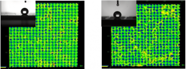 上述实验内容通过控制变量法确定了激光能量密度的选用范围,而影响表面润湿性的工艺参数还包括激光扫描速度、扫描间距和重复次数,采用相同方法依次缩小最优工艺参数的选择范围。 经过不断的参数优化,当能量密度为3.389J/cm²,速度为800mm/s,扫描间距为30μm,重复次数为6次和能量密度为4.44J/cm²,速度为1000mm/s,扫描间距为30μm,重复次数为7次时,在低温热处理后表面达到了超疏水的效果,其三维形貌如图1.9所示,可以观察到微织构呈周期性排列且凹坑存在一定深度,对其润湿性进行测量,静态接触角分别达到了150.67°和151.19°;采用高速摄像头对其滚动角拍摄,如图1.10所示,测量滚动角为3.5°,完全符合超疏水表面的要求。 图1.9 超疏水表面三维形貌图及接触角测量