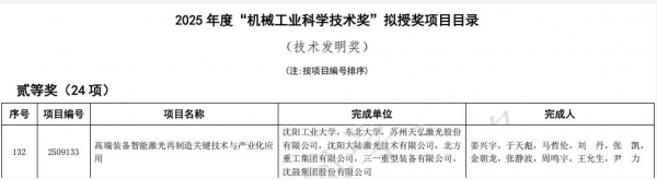 国家级: 机械工业科学技术奖二等奖 在由中国机械工业联合会、中国机械工程学会联合组织的2025年度“机械工业科学技术奖”评审中,天弘激光作为核心完成单位参与的项目《高端装备智能激光再制造关键技术与产业化应用》荣获二等奖。 该项目聚焦航空航天、能源装备、重型机械等国家重大工程领域,突破了激光熔覆成形精度控制、多材料复合再制造、智能化在线监测等关键技术瓶颈,实现了再制造零部件性能优于新品的跨越式提升,为我国高端装备延寿增效、绿色低碳转型提供了强有力的技术支撑。