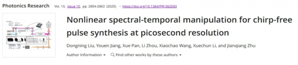 相关研究成果以“Nonlinear Spectral-Temporal Manipulation for Chirp-Free Pulse Synthesis at Picosecond Resolution”为题发表于Photonics Research。 光学任意波形发生技术在高能量密度物理、激光微加工及光通信等领域具有广泛的应用价值。其中,随机脉冲序列 (Spike Train of Uneven Duration and Delay, STUD) 作为一种可有效抑制激光与等离子体相互作用中各类不稳定性的技术方案,备受关注。然而,当前主流的脉冲整形技术存在时域分辨率不足、记录长度受限以及存在残余啁啾等问题,尚难以满足STUD脉冲的技术要求。 图 1. (a)FOCUS原理图;(b)频率-时间转换示意图;(c)实验装置图。 针对上述挑战,研究团队创新性地提出一种基于光波导四波混频的脉冲时域任意整形技术 (Four-wave Optical-waveguided Chirp-free Ultrafast Shaping, FOCUS),并成功实现了时域分辨率2ps、记录长度400ps、中心波长可调谐范围3.5nm的消啁啾脉冲序列输出。该技术为STUD等方案所需的激光脉冲产生提供了可行的技术路径,同时具备向集成化光任意波形发生芯片发展的潜力。 图 2. (a)和(b)光谱整形图;(c)和(d)基于四波混频的光谱转录结果图;(e)和(f)消啁啾的高分辨率激光脉冲序列。