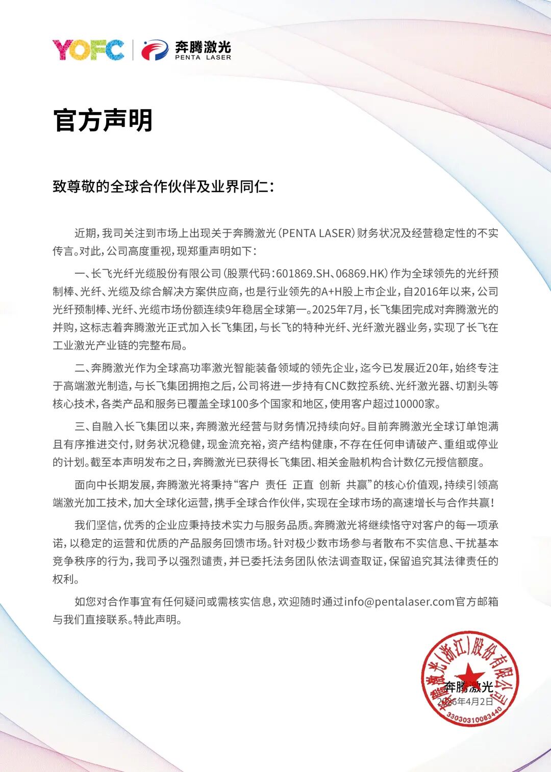 关于奔腾激光财务状态及经营稳定性的官方声明