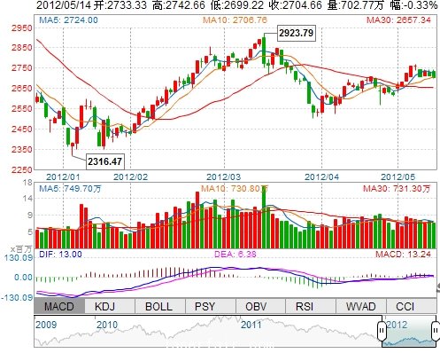 今 开: 2733.33 最 高: 2742.66 最 低: 2699.22 振 幅: 1.60% 昨 收: 2713.51 成交量: 7027675手 成交额: 921312.41万 换手率: --