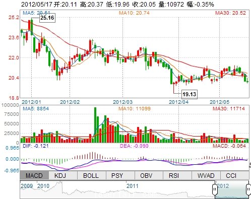 今 开: 20.11 成交量: 10971手 振 幅: 2.04% 最 高: 20.37 成交额: 2207.99万 换手率: 0.92% 最 低: 19.96 总市值: 85.65亿 市净率: 6.04 昨 收: 20.12 流通...