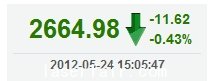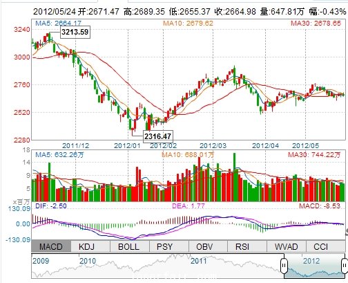 今 开: 2671.47 最 高: 2689.35 最 低: 2655.37 振 幅: 1.27% 昨 收: 2676.60 成交量: 6478145手 成交额: 887772.51万 换手率: --