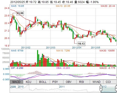 今 开: 19.72 成交量: 6023手 振 幅: 2.02% 最 高: 19.85 成交额: 1179.38万 换手率: 0.50% 最 低: 19.45 总市值: 83.13亿 市净率: 5.86 昨 收: 19.85 流通市...
