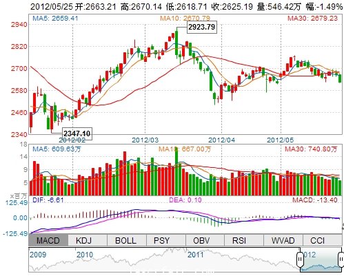 今 开: 2663.21 最 高: 2670.14 最 低: 2618.71 振 幅: 1.93% 昨 收: 2664.98 成交量: 5464169手 成交额: 747313.14万 换手率: --