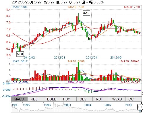今 开: 0.00 成交量: 0手 振 幅: 0.00% 最 高: 0.00 成交额: 0.00万 换手率: 0.00% 最 低: 0.00 总市值: 12.11亿 市净率: 2.99 昨 收: 6.97 流通市值: 12.11...