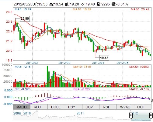 今 开: 19.53 成交量: 9296手 振 幅: 1.75% 最 高: 19.54 成交额: 1795.76万 换手率: 0.78% 最 低: 19.20 总市值: 82.88亿 市净率: 5.84 昨 收: 19.46 流通市...
