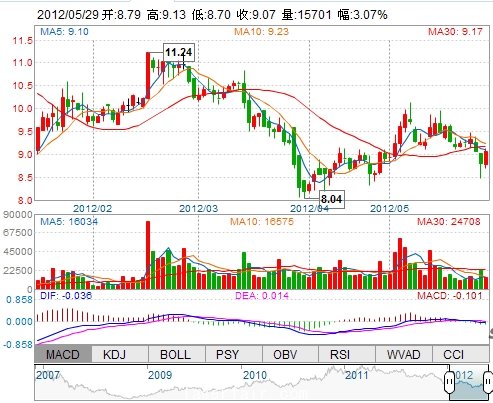 今 开: 8.79 成交量: 15701手 振 幅: 4.89% 最 高: 9.13 成交额: 1408.32万 换手率: 0.81% 最 低: 8.70 总市值: 18.07亿 市净率: 3.75 昨 收: 8.80 流通市值...