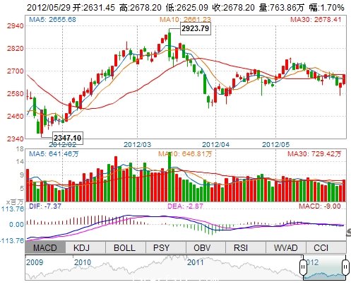 今 开: 2631.45 最 高: 2678.20 最 低: 2625.09 振 幅: 2.02% 昨 收: 2633.42 成交量: 7638620手 成交额: 999216.48万 换手率: --