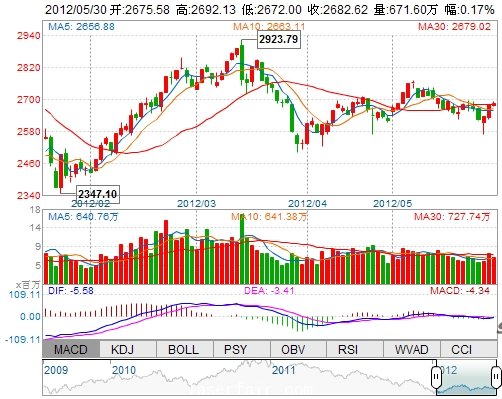 今 开: 2675.58 最 高: 2692.13 最 低: 2672.00 振 幅: 0.75% 昨 收: 2678.20 成交量: 6715962手 成交额: 902012.56万 换手率: --
