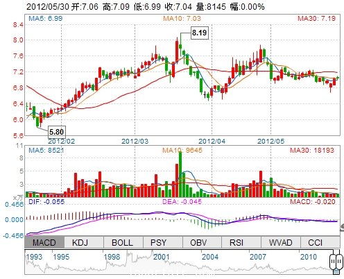 今 开: 7.06 成交量: 8145手 振 幅: 1.42% 最 高: 7.09 成交额: 573.42万 换手率: 0.47% 最 低: 6.99 总市值: 12.23亿 市净率: 3.02 昨 收: 7.04 流通市值: ...