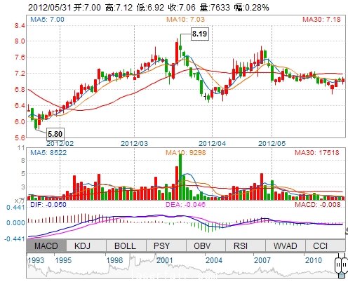 今 开: 7.00 成交量: 7633手 振 幅: 2.84% 最 高: 7.12 成交额: 538.53万 换手率: 0.44% 最 低: 6.92 总市值: 12.26亿 市净率: 3.03 昨 收: 7.04 流通市值: ...