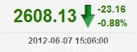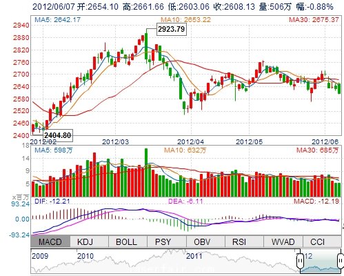 今 开: 2654.10 最 高: 2661.66 最 低: 2603.06 振 幅: 2.23% 昨 收: 2631.28 成交量: 5060731手 成交额: 690128.42万 换手率: --