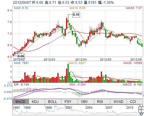 今 开: 6.66 成交量: 5191手 振 幅: 2.72% 最 高: 6.71 成交额: 343.33万 换手率: 0.30% 最 低: 6.53 总市值: 11.34亿 市净率: 2.80 昨 收: 6.62 流通市值: ...