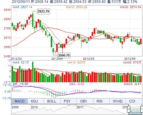 今 开: 2608.14 最 高: 2659.42 最 低: 2604.53 振 幅: 2.11% 昨 收: 2601.57 成交量: 5308870手 成交额: 782276.61万 换手率: --