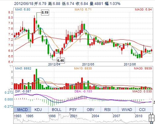 今 开: 6.79 成交量: 4880手 振 幅: 2.07% 最 高: 6.88 成交额: 332.99万 换手率: 0.28% 最 低: 6.74 总市值: 11.88亿 市净率: 2.94 昨 收: 6.77 流通市值: ...