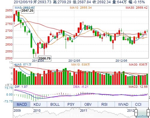 今 开: 2693.73 最 高: 2709.29 最 低: 2687.84 振 幅: 0.80% 昨 收: 2696.31 成交量: 6439032手 成交额: 909876.43万 换手率: --