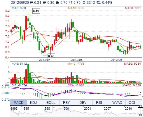 今 开: 6.81 成交量: 3311手 振 幅: 1.61% 最 高: 6.86 成交额: 225.39万 换手率: 0.19% 最 低: 6.75 总市值: 11.79亿 市净率: 2.91 昨 收: 6.82 流通市值: ...