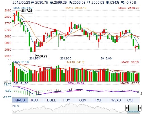 今 开: 2580.75 最 高: 2599.29 最 低: 2556.58 振 幅: 1.66% 昨 收: 2575.83 成交量: 5342471手 成交额: 736074.99万 换手率: --