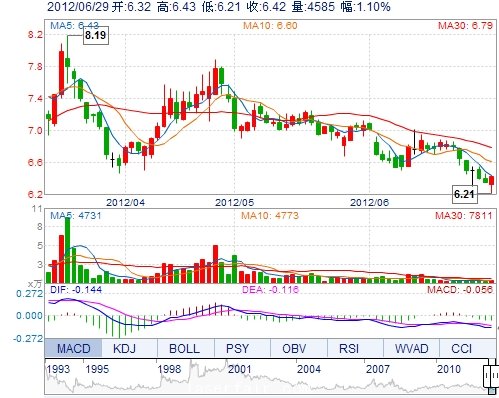 今 开: 6.32 成交量: 4585手 振 幅: 3.46% 最 高: 6.43 成交额: 290.91万 换手率: 0.26% 最 低: 6.21 总市值: 11.15亿 市净率: 2.76 昨 收: 6.35 流通市值: ...