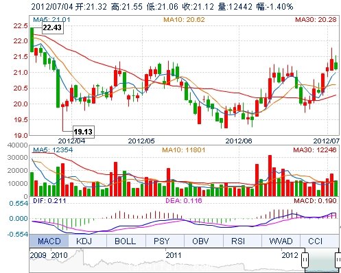 今 开: 21.32 成交量: 12441手 振 幅: 2.29% 最 高: 21.55 成交额: 2639.64万 换手率: 1.04% 最 低: 21.06 总市值: 90.22亿 市净率: 6.36 昨 收: 21.42 流通...