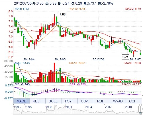 今 开: 6.36 成交量: 5736手 振 幅: 1.70% 最 高: 6.38 成交额: 362.03万 换手率: 0.33% 最 低: 6.27 总市值: 10.92亿 市净率: 2.70 昨 收: 6.47 流通市值: ...