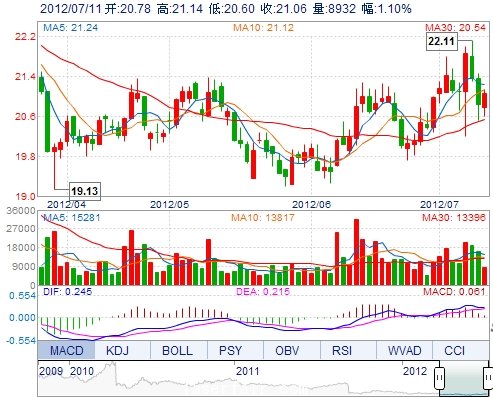 今 开: 20.78 成交量: 8931手 振 幅: 2.59% 最 高: 21.14 成交额: 1868.01万 换手率: 0.75% 最 低: 20.60 总市值: 89.97亿 市净率: 6.34 昨 收: 20.83 流通市...