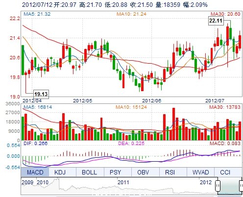 今 开: 20.97 成交量: 18358手 振 幅: 3.89% 最 高: 21.70 成交额: 3934.78万 换手率: 1.53% 最 低: 20.88 总市值: 91.85亿 市净率: 6.48 昨 收: 21.06 流通...
