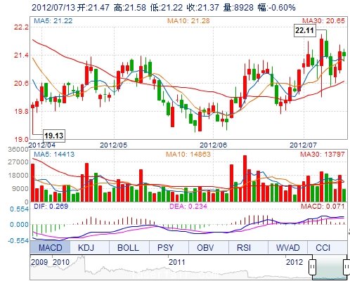 今 开: 21.47 成交量: 8927手 振 幅: 1.67% 最 高: 21.58 成交额: 1912.67万 换手率: 0.75% 最 低: 21.22 总市值: 91.29亿 市净率: 6.44 昨 收: 21.50 流通市...