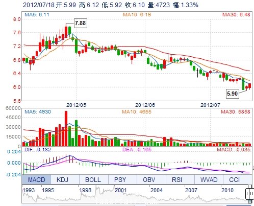 今 开: 5.99 成交量: 4722手 振 幅: 3.32% 最 高: 6.12 成交额: 284.28万 换手率: 0.27% 最 低: 5.92 总市值: 10.59亿 市净率: 2.62 昨 收: 6.02 流通市值: ...