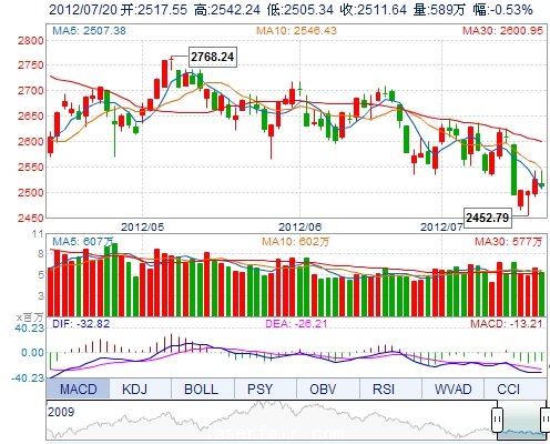 今 开: 2517.55 最 高: 2542.24 最 低: 2505.34 振 幅: 1.46% 昨 收: 2524.92 成交量: 5892623手 成交额: 680822.57万 换手率: --