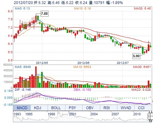 今 开: 6.32 成交量: 10790手 振 幅: 3.77% 最 高: 6.46 成交额: 686.36万 换手率: 0.62% 最 低: 6.22 总市值: 10.84亿 市净率: 2.68 昨 收: 6.36 流通市值:...
