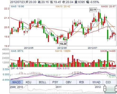 今 开: 20.00 成交量: 6395手 振 幅: 3.52% 最 高: 20.16 成交额: 1266.91万 换手率: 0.53% 最 低: 19.45 总市值: 85.61亿 市净率: 6.04 昨 收: 20.15 流通市...