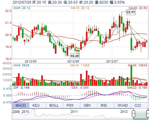 今 开: 20.15 成交量: 8230手 振 幅: 1.34% 最 高: 20.30 成交额: 1660.45万 换手率: 0.69% 最 低: 20.03 总市值: 86.29亿 市净率: 6.08 昨 收: 20.09 流通市...