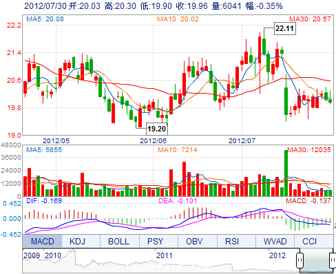 今 开: 20.03 成交量: 6040手 振 幅: 2.00% 最 高: 20.30 成交额: 1212.25万 换手率: 0.50% 最 低: 19.90 总市值: 85.27亿 市净率: 6.01 昨 收: 20.03 流通市...
