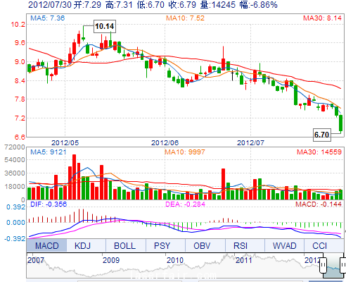 今 开: 7.29 成交量: 14245手 振 幅: 8.37% 最 高: 7.31 成交额: 990.05万 换手率: 0.73% 最 低: 6.70 总市值: 13.53亿 市净率: 2.81 昨 收: 7.29 流通市值:...