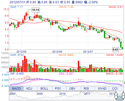 今 开: 6.80 成交量: 8981手 振 幅: 3.24% 最 高: 6.85 成交额: 601.72万 换手率: 0.46% 最 低: 6.63 总市值: 13.25亿 市净率: 2.75 昨 收: 6.79 流通市值: ...