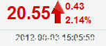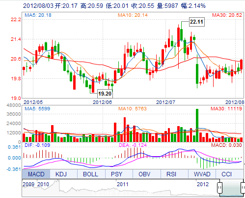 今 开: 20.17 成交量: 5987手 振 幅: 2.88% 最 高: 20.59 成交额: 1220.50万 换手率: 0.50% 最 低: 20.01 总市值: 87.79亿 市净率: 6.19 昨 收: 20.12 流通市...