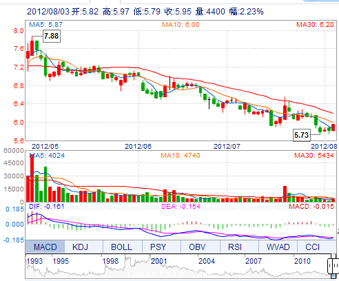 今 开: 5.82 成交量: 4399手 振 幅: 3.09% 最 高: 5.97 成交额: 258.93万 换手率: 0.25% 最 低: 5.79 总市值: 10.33亿 市净率: 2.55 昨 收: 5.82 流通市值: ...