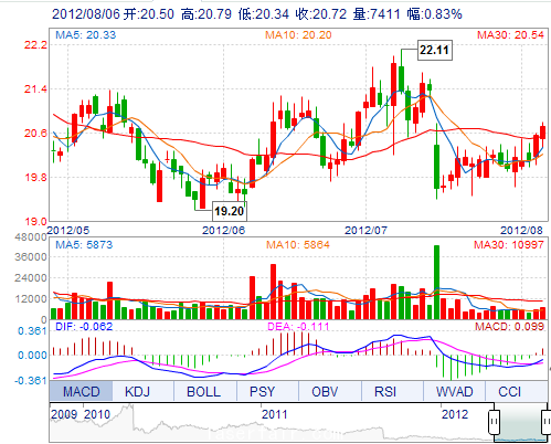 今 开: 20.50 成交量: 7410手 振 幅: 2.19% 最 高: 20.79 成交额: 1526.21万 换手率: 0.62% 最 低: 20.34 总市值: 88.52亿 市净率: 6.24 昨 收: 20.55 流通市...