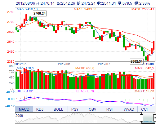 今 开: 2476.14 最 高: 2542.26 最 低: 2472.24 振 幅: 2.82% 昨 收: 2483.51 成交量: 6791248手 成交额: 911587.87万 换手率: --
